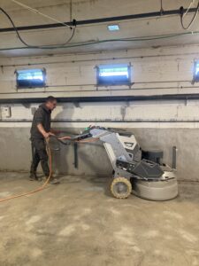 Les sols et les murs sont entièrement poncés afin d’assurer une adhérence optimale du revêtement.